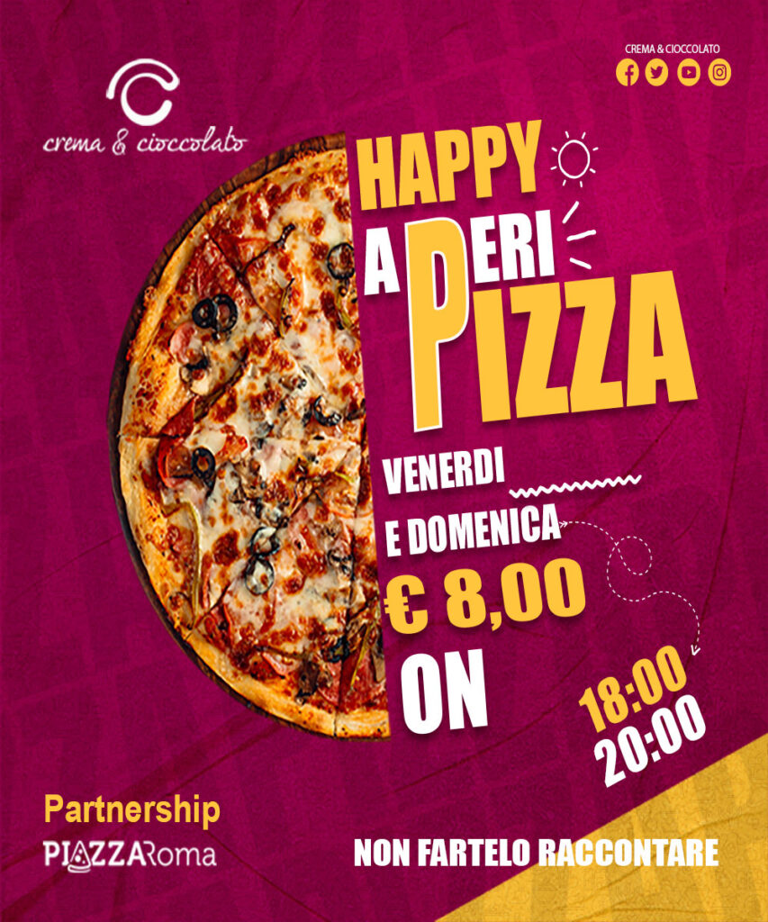 Tutti i Venerdi e le Domeniche dalle 18:00 alle 20:00 Il nuovo modo di vivere l’appy hour con formula pizza. Drink Alcolici: Aperol spritz, Campari spritz, Hugo, Traditore spritz, Negroni, Mojito, Prosecco, Calice di vino, bianco e rosso. Virgin Cocktail e tanto altro. Partnership Piazza Roma 58 Piedimonte Matese 81016 CE
